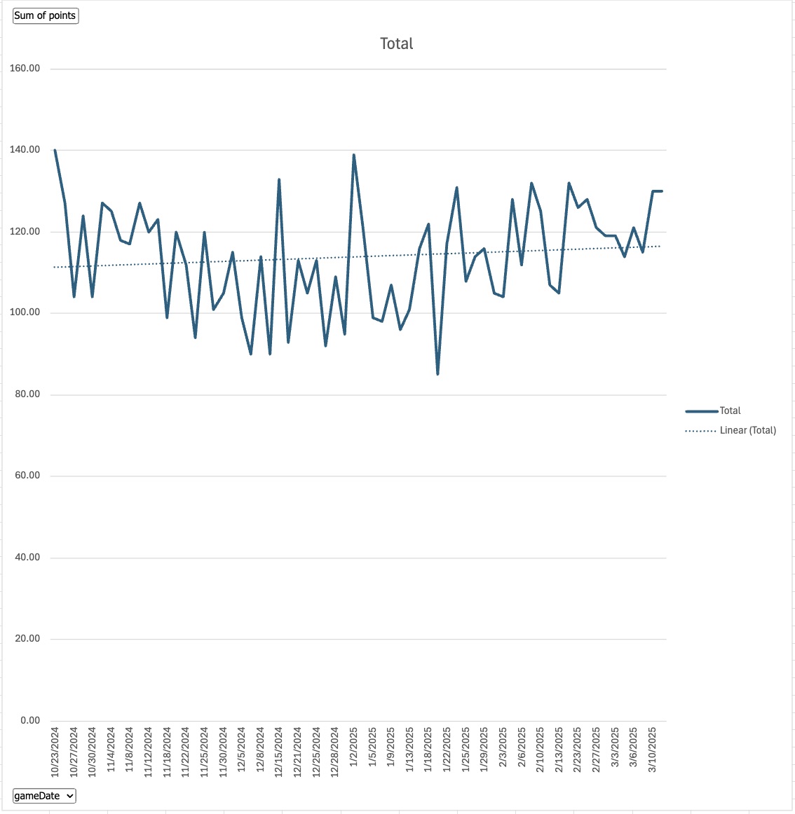 The histogram and pie chart clearly show the team's top scorers, with Stephen Curry leading at 1,384 points (18.4% of the total), followed by Buddy Hield (763), Andrew Wiggins (755), and Moses Moody (573). The line chart shows the team's scoring fluctuations, generally having a strong offensive performance with consistent 100+ point games. Though, occasional dips occur like the season-low 85 points on 1/20/2025. The highest-scoring game (140 points on 10/23/2024) reflects peak efficiency, while a late-season surge in February and March, featuring frequent 120+ point games, may suggest improvement. Players with minimal scoring, like Reece Beekman and Yuri Collins, likely serve defensive or bench roles. Overall, the team maintains stable offensive production with promising late-season momentum.